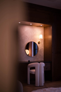 Im Mittelpunkt stand die Optimierung des Grundrisses sowie die Ausarbeitung eines Farb- und Materialkonzeptes, das die architektonische Klarheit aufgreift und zugleich Wärme und Persönlichkeit einbringt. Ich entwarf Wandverkleidungen, maßgefertigte Schreinereinbauten, die Grund- und Akzentbeleuchtung sowie die passende Möblierung. Auch Küche und Bäder entstanden als individuelle Innenarchitekturentwürfe, die ich gemeinsam mit bewährten Partnern zur Umsetzung brachte