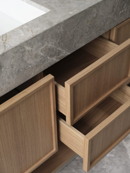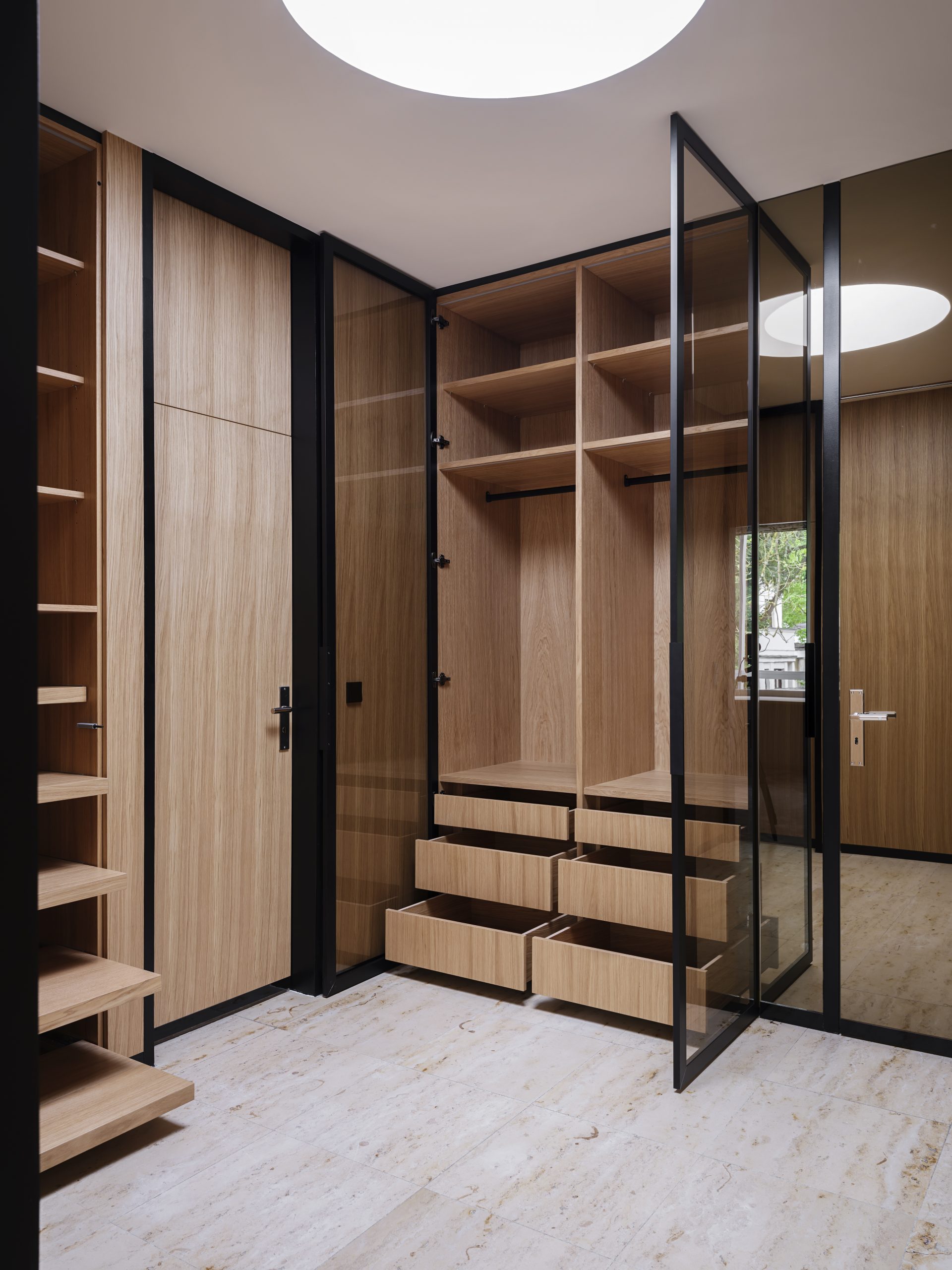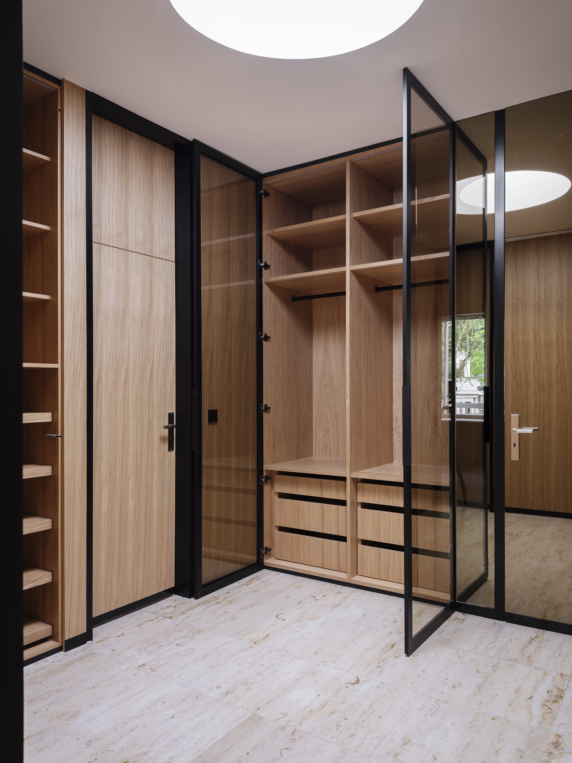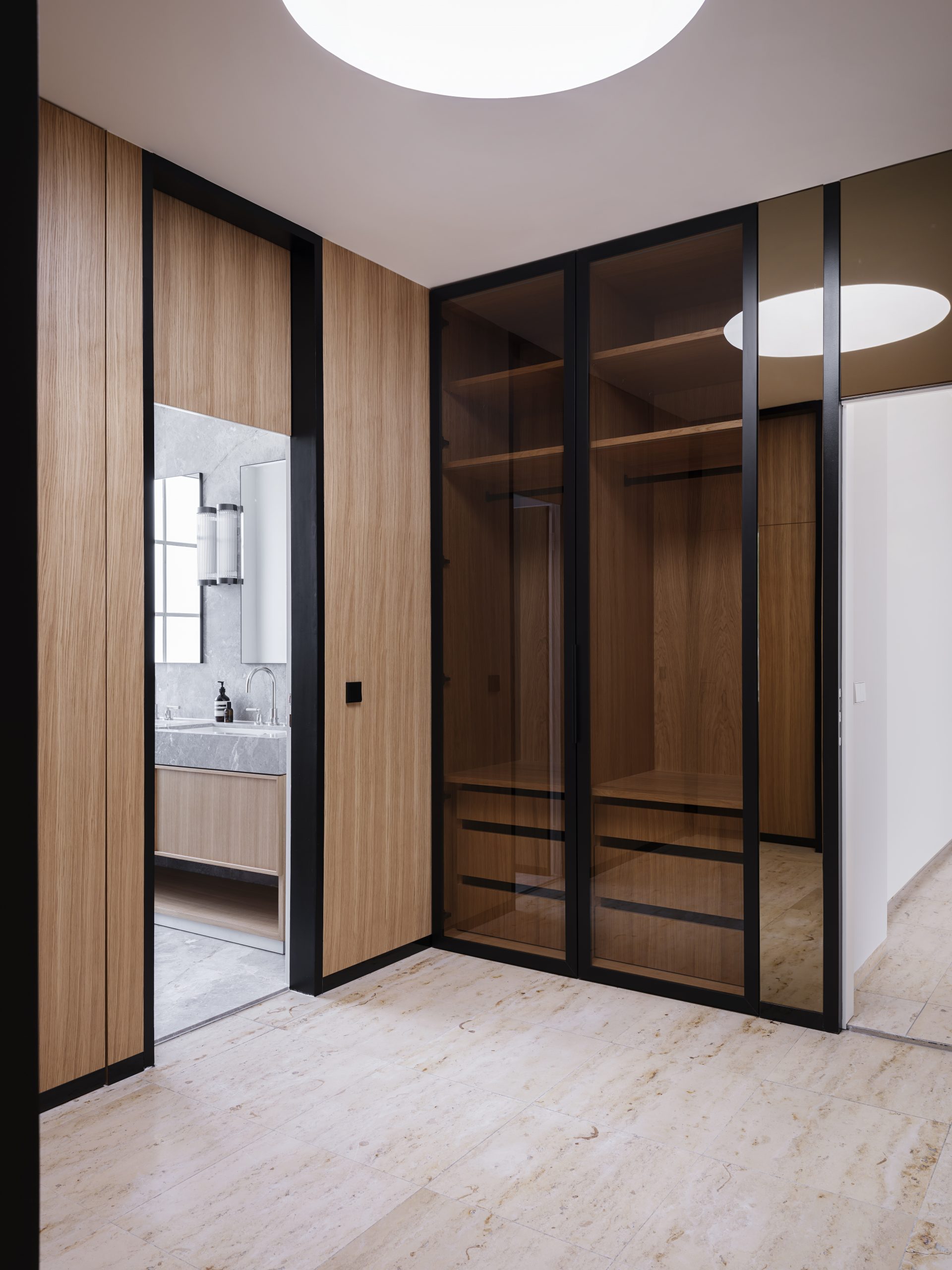 Die Durchgangsankleide wurde vollständig im Stil des Altbestands mit Eichenholz, Rauchglastüren und schwarzen vertikalen Elementen neu ausgebaut. Das bestehende Masterbad wurde umfassend neugestaltet: Es erhielt eine zusätzliche Dusche und wurde mit Naturstein sowie maßgefertigten Möbeln aus Eiche ergänzt.