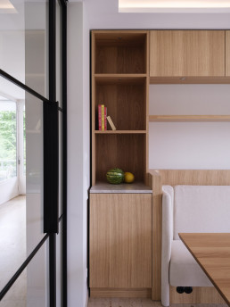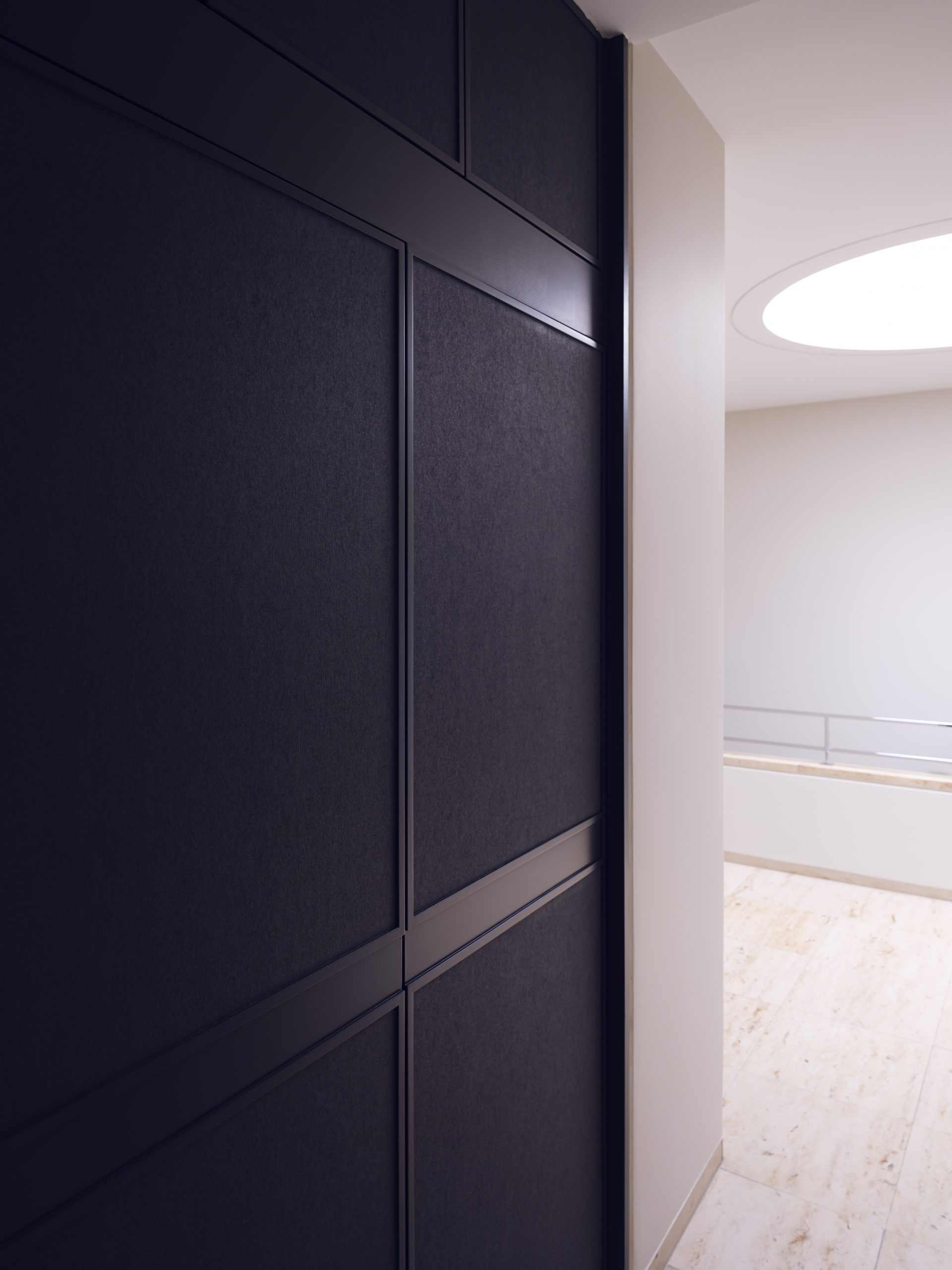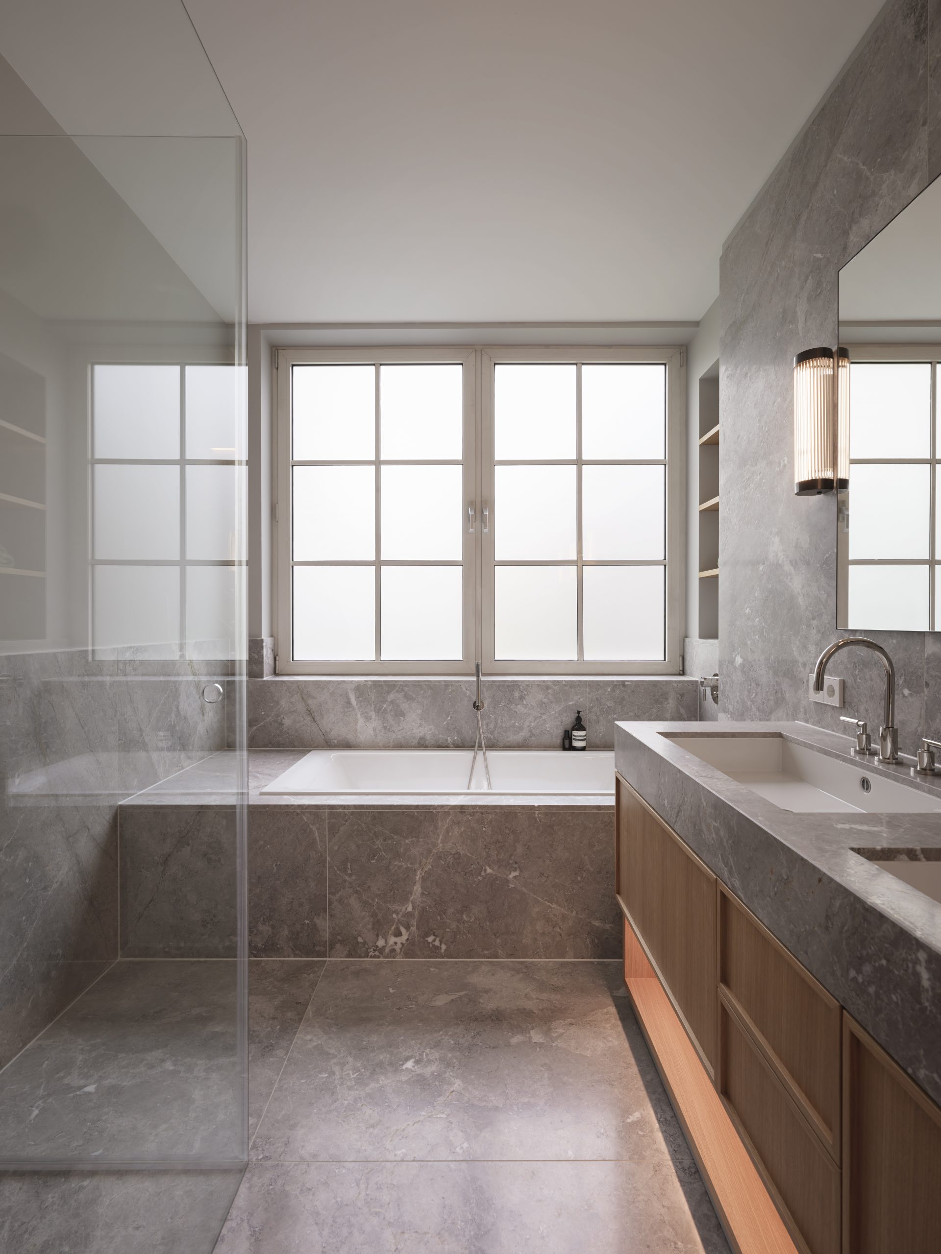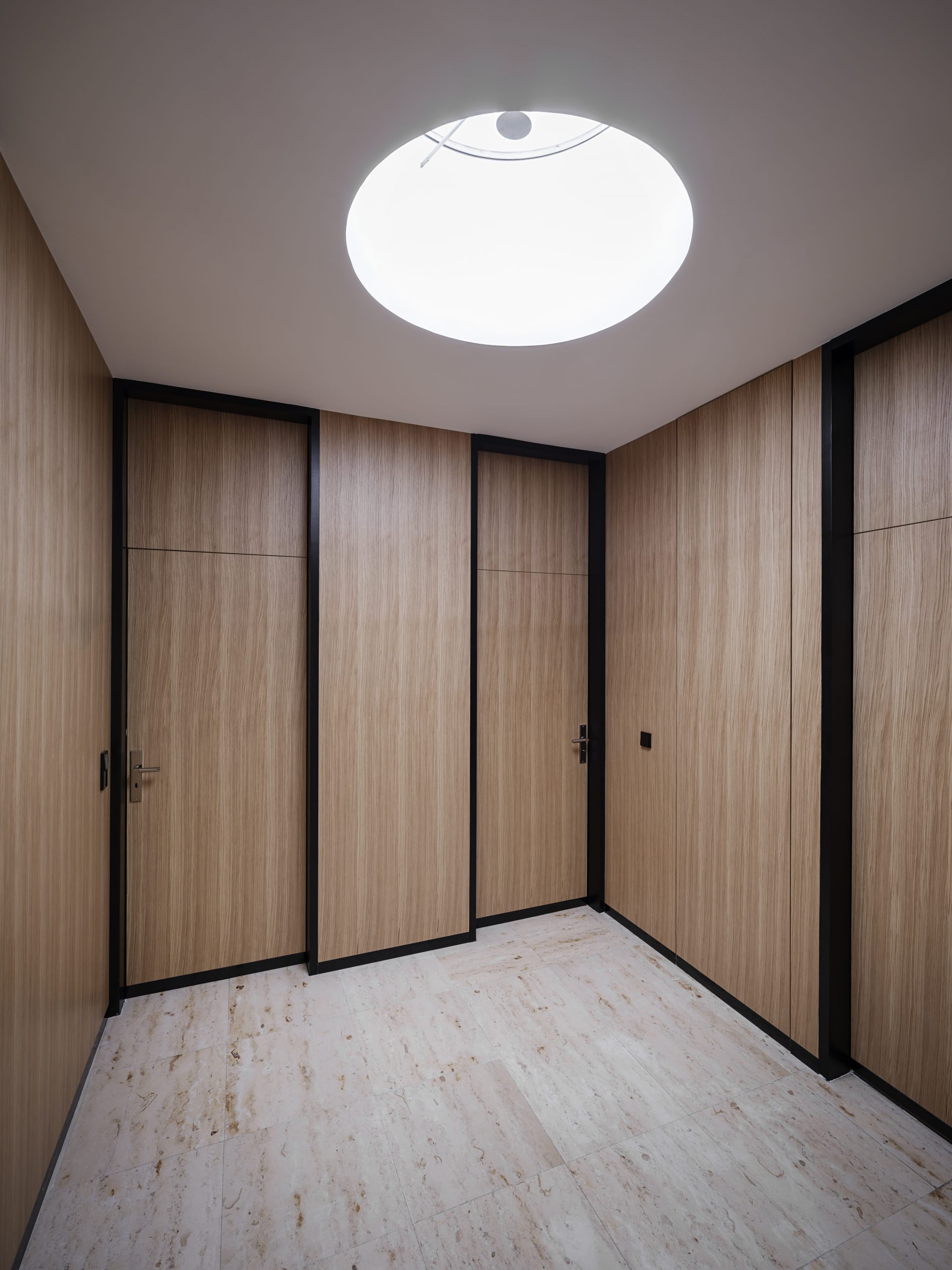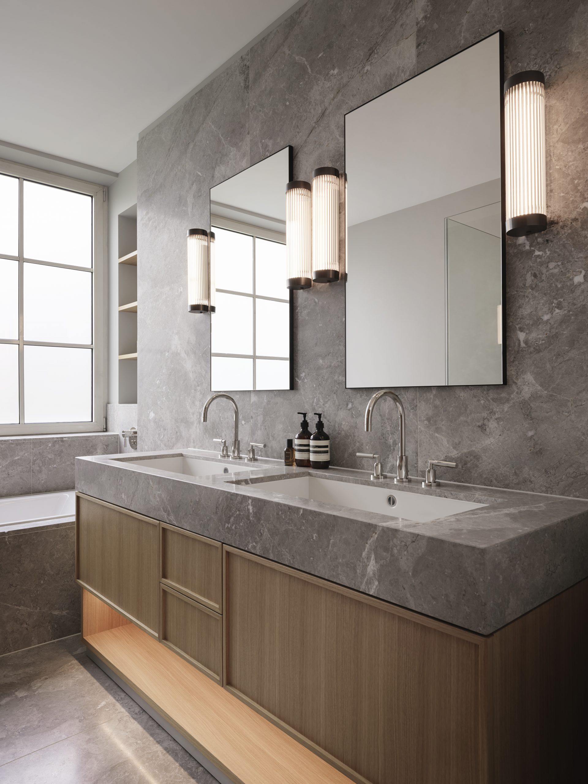 Die Durchgangsankleide wurde vollständig im Stil des Altbestands mit Eichenholz, Rauchglastüren und schwarzen vertikalen Elementen neu ausgebaut. Das bestehende Masterbad wurde umfassend neugestaltet: Es erhielt eine zusätzliche Dusche und wurde mit Naturstein sowie maßgefertigten Möbeln aus Eiche ergänzt.