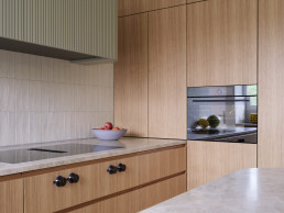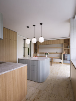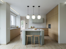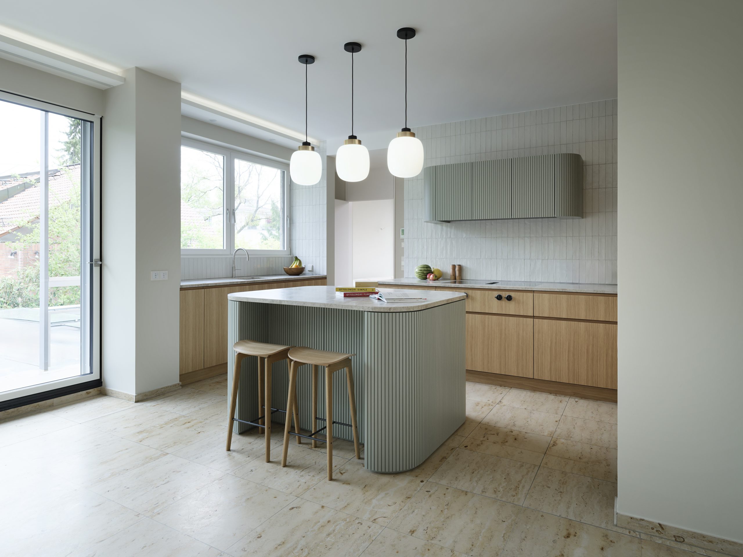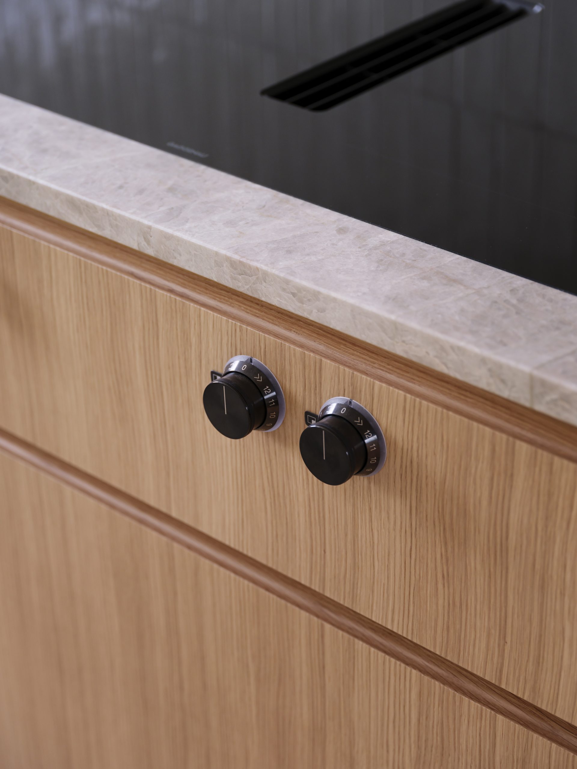 Die neue Küche wurde vergrößert und in heller Eiche mit einer großzügigen Insel gestaltet – ein zeitgemäßer, offener Raum, der als Mittelpunkt des Familienlebens dient.