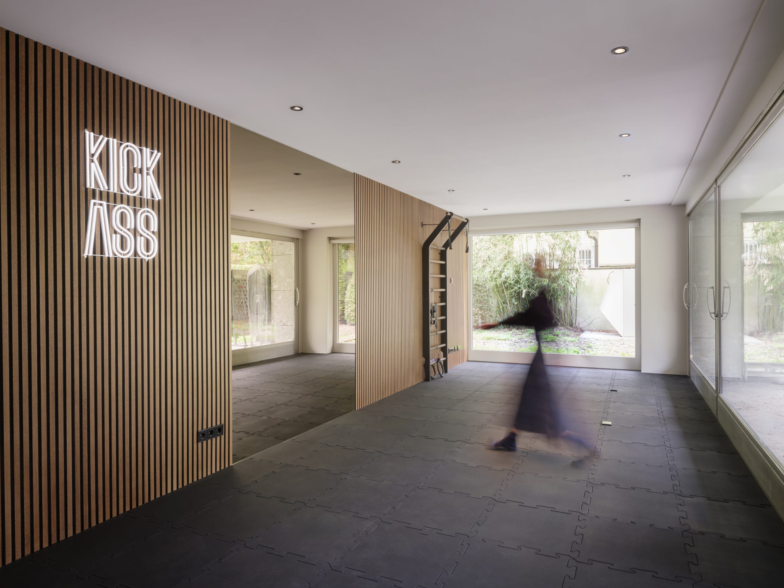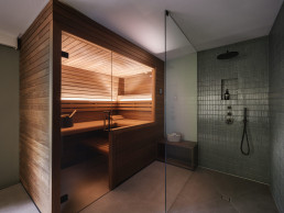 Der ehemalige Poolbereich wurde zur modernen Fitness- und Wellnessoase umfunktioniert. Der Eingangsbereich erhielt mit einer grafischen Tapete ein markantes optisches Highlight. Grün- und Blautöne ziehen sich als roter Faden durch das gesamte Haus und schaffen ein stimmiges Gestaltungskonzept.